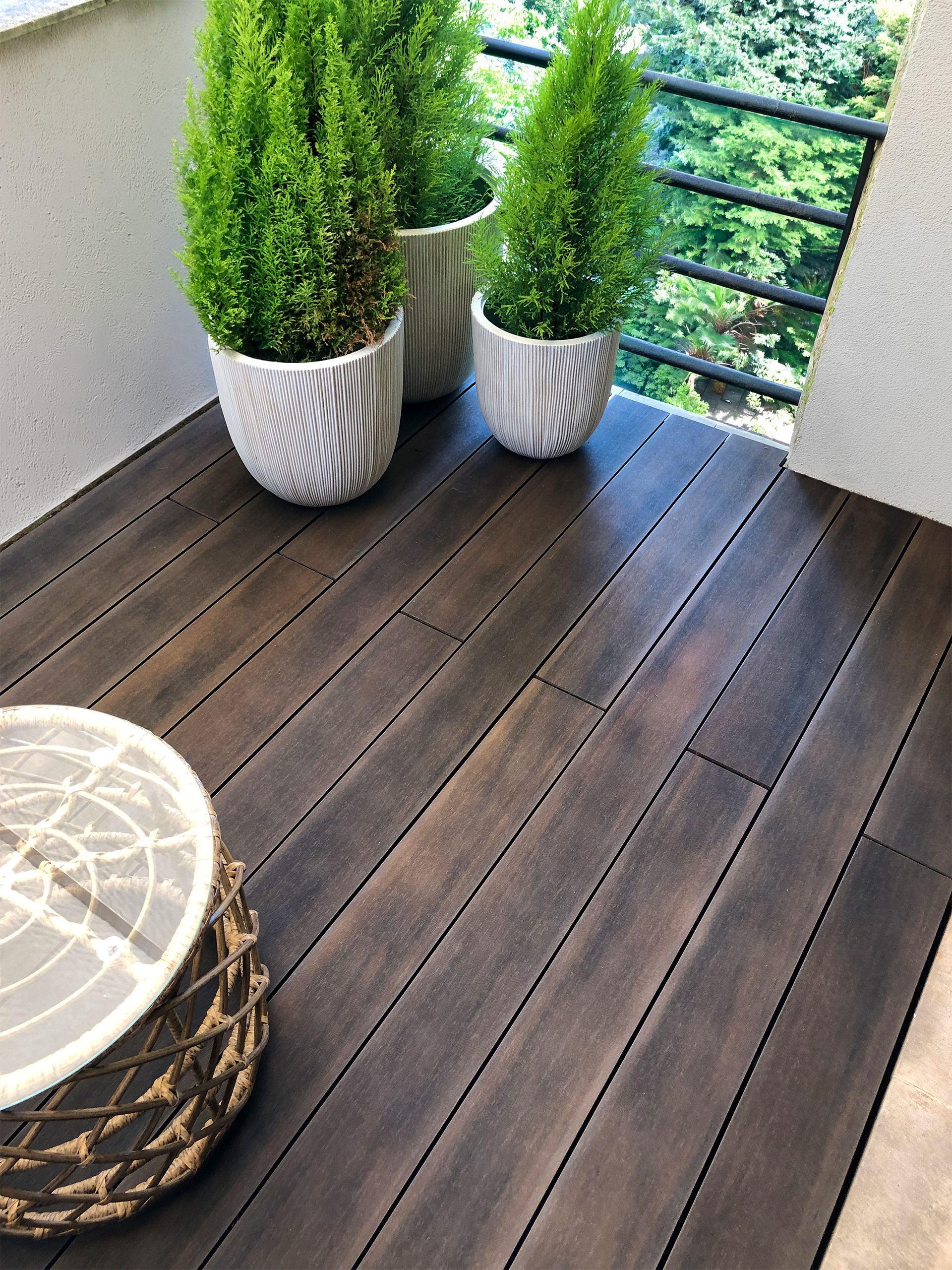 Varandas de 3 a 10 m², com cantos, pilares e soleiras. Réguas cortadas em obra à medida do espaço. Perfis de remate para acabamento limpo nos limites.