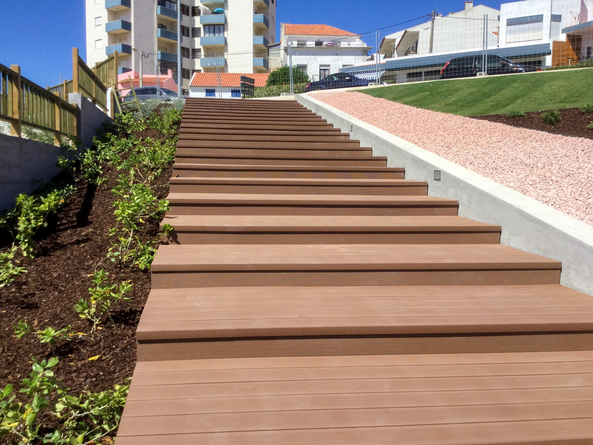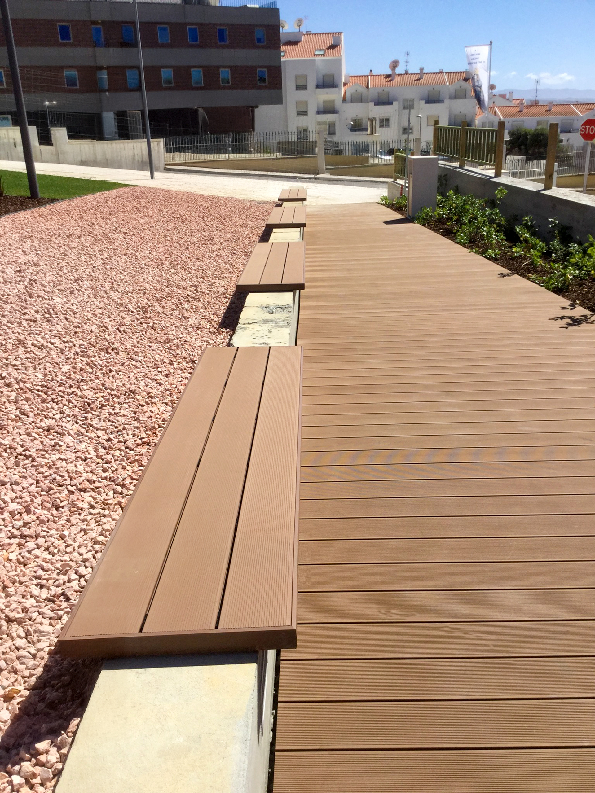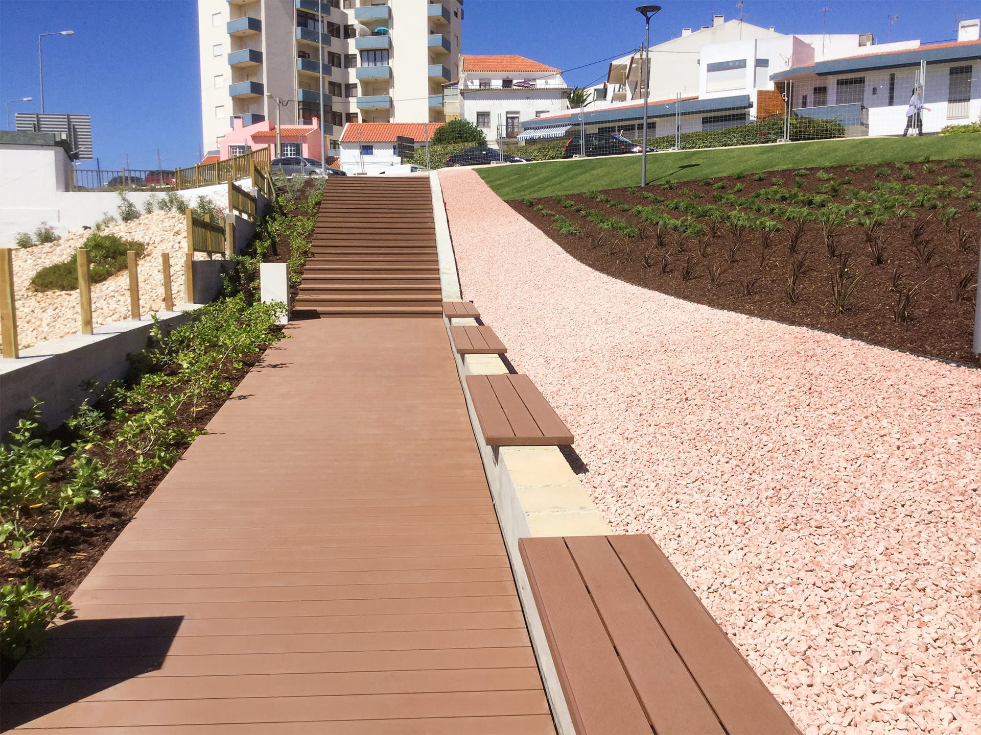 Jardín en Ericeira donde se desarrollaron dos zonas diferenciadas: un área de paso continuo, con bancos a lo largo del recorrido y escalinata, y un recorrido de acceso situado junto a la entrada de la Ericeira Business Factory. La solución recurrió a la instalación de tarima composite CDECK® en lama maciza, garantizando durabilidad, seguridad y una respuesta adecuada a un contexto de uso intensivo.
