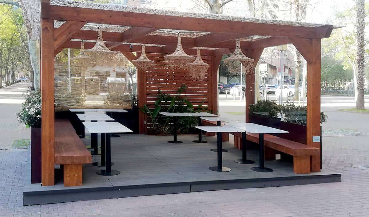Muchas terrazas de bares y restaurantes ocupan espacio público y están sujetas a licencia municipal. Con una estructura autoportante, la tarima no se fija al suelo — puede montarse y desmontarse sin perforar el pavimento público.